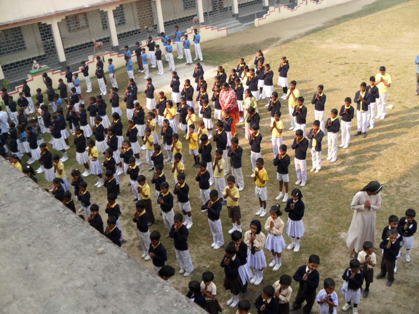 Momento della preghiera mattutina. Tutti in uniforme, il colore secondo la classe.
