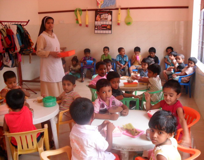 Suor Mary Riya assiste i bambini alla mesnsa della scuola materna
