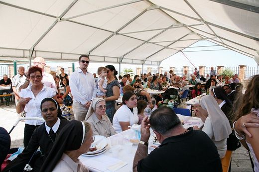 con canti armoniosi e appropriati.  Il pranzo condiviso in fraternità da tutta l’assemblea nel terrazzo panoramico dell’Istituto, è stato generosamente preparato ed offerto dall’AVIS e da diverse agenzie commerciali della zona. La spontanea e sentita gratitudine è stato il segno della gioiosa e toccante partecipazione dei presenti. Dopo il taglio della torta da parte delle due celebranti, viene letto il messaggio augurale della carissima Madre Generale.