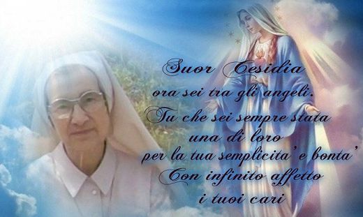 Desidero esprimere la viva partecipazione al dolore della Comunità di Roma per la scomparsa della cara suor Cesidia. L'ho conosciuta personalmente durante gli anni del mio servizio istituzionale a Roma, soprattutto quando mi recavo a celebrare la Messa mattutina nella cappella delle Consorelle dell'Orfanotrofio. La ricordo come persona molto semplice, affabile e sempre sorridente. L'affido al Signore ed alla sua misericordia, perché riceva il premio meritato per le sue fatiche. Il suo esempio e la sua testimonianza rimane l'eredità soprattutto per le giovani generazioni di suore. Assicuro alle consorelle ed in particolare alla sorella suora suor Felicia, la mia vicinanza con la preghiera di suffragio. P. Angelo Sardone